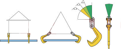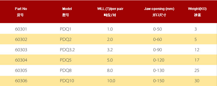 .用途:单块或多块钢板的水平吊运.采用优质低碳合金钢制造.必须与平衡梁配套使用,吊运过程中不得碰撞被吊物.上部滚轮设计,避免钢丝绳损伤.额定载荷是指吊钳成对使用、吊点夹具为60度时允许起吊的最大重量,吊装作业中4只配套使用.可自动脱钩